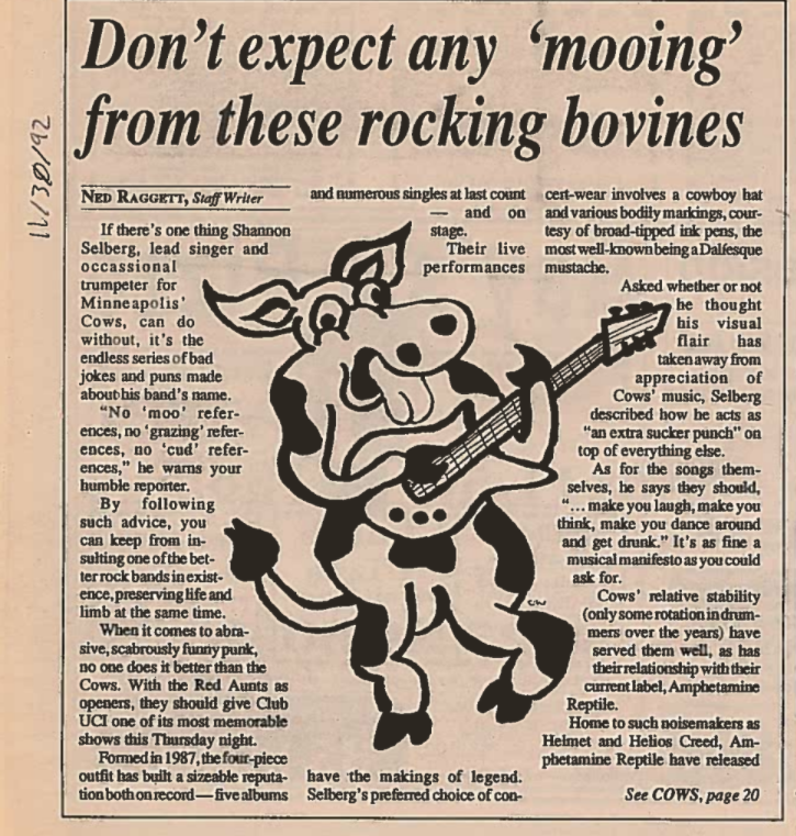 2. Cows If the noise rock neophyte gets into any band from this essay, I hope it’s Cows. Underappreciated at the time and even more so now, Minneapolis’ Cows’ combination of compactor-scraping riffage and Oblivion Ha Ha “humor” has arguably aged better than any other noise rock band. Cows guitar, as played by Thor Eisentrager, sounded like disintegration loops of Howling Wolf riffs played from a black & white box television found in the woods, while the rest of the band sounded like they were furiously trying to get out of the abandoned refrigerator covered in underbrush and old, wet Playboys just a few feet away. Plus there were horns.
